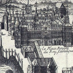 La Villa de Madrid, aparece desarrollada de forma horizontal. Los edificios y las manzanas están representadas con una perspectiva convencional.En la mitad inferior del mismo, las manzanas y los edificios tienen una representación más clara y dispersa mientras que la parte superior se representa con amontonamiento y errores. En la parte superior aparecen a ambos lados dos coronas con los escudos de la Villa de Madrid y el escudo Real. En el medio se puede leer el título del plano “Madrid capital d´Espagne”. En la parte inferior, en un recuadro, hay una representación del Monasterio del El Escorial. Visión: Axonométrica de la ciudad (Vista de pájaro)